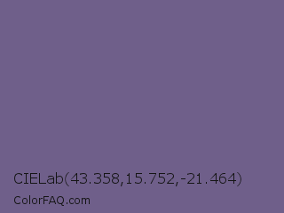 CIELab 43.358,15.752,-21.464 Color is a normal violet color and the nearest color is Rum #796989. Hex code #6f5f8a and RGB value is rgb(111,95,138). In RGB color space, this color is composed of 44% red, 37% green, 54% blue, In CMYK color space, this color is composed of 20% cyan, 31% magenta, 0% yellow , 46% black , In HSL color space, this color has a hue angle of 262° , 18% saturation and 46% lightness.
