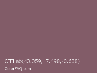 CIELab 43.359,17.498,-0.638 Color is a normal rose color and the nearest color is Falcon #7f626d. Hex code #825c68 and RGB value is rgb(130,92,104). In RGB color space, this color is composed of 51% red, 36% green, 41% blue, In CMYK color space, this color is composed of 0% cyan, 29% magenta, 20% yellow , 49% black , In HSL color space, this color has a hue angle of 341° , 17% saturation and 44% lightness.