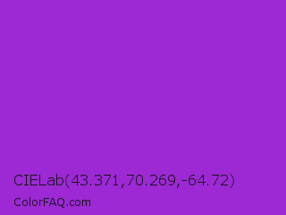 CIELab 43.371,70.269,-64.72 Color is a normal purple color and the nearest color is Dark Orchid #9932cc. Hex code #9c29d4 and RGB value is rgb(156,41,212). In RGB color space, this color is composed of 61% red, 16% green, 83% blue, In CMYK color space, this color is composed of 26% cyan, 81% magenta, 0% yellow , 17% black , In HSL color space, this color has a hue angle of 280° , 68% saturation and 50% lightness.
