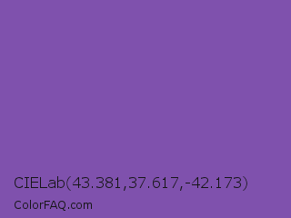 CIELab 43.381,37.617,-42.173 Color is a normal violet color and the nearest color is Royal Purple #7851a9. Hex code #7f51ad and RGB value is rgb(127,81,173). In RGB color space, this color is composed of 50% red, 32% green, 68% blue, In CMYK color space, this color is composed of 27% cyan, 53% magenta, 0% yellow , 32% black , In HSL color space, this color has a hue angle of 270° , 36% saturation and 50% lightness.