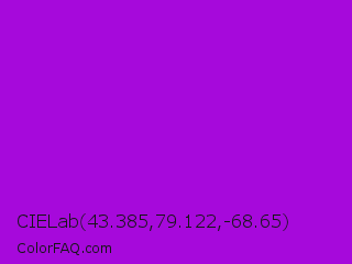 CIELab 43.385,79.122,-68.65 Color is a normal purple color and the nearest color is Vivid Mulberry #b80ce3. Hex code #a609db and RGB value is rgb(166,9,219). In RGB color space, this color is composed of 65% red, 4% green, 86% blue, In CMYK color space, this color is composed of 24% cyan, 96% magenta, 0% yellow , 14% black , In HSL color space, this color has a hue angle of 285° , 92% saturation and 45% lightness.