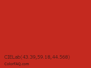 CIELab 43.39,59.18,44.568 Color is a normal red color and the nearest color is Thunderbird #c02b18. Hex code #c4291f and RGB value is rgb(196,41,31). In RGB color space, this color is composed of 77% red, 16% green, 12% blue, In CMYK color space, this color is composed of 0% cyan, 79% magenta, 84% yellow , 23% black , In HSL color space, this color has a hue angle of 4° , 73% saturation and 45% lightness.