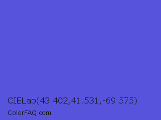 CIELab 43.402,41.531,-69.575 Color is a normal indigo color and the nearest color is Majorelle Blue #6050dc. Hex code #5853dc and RGB value is rgb(88,83,220). In RGB color space, this color is composed of 35% red, 33% green, 86% blue, In CMYK color space, this color is composed of 60% cyan, 62% magenta, 0% yellow , 14% black , In HSL color space, this color has a hue angle of 242° , 66% saturation and 59% lightness.