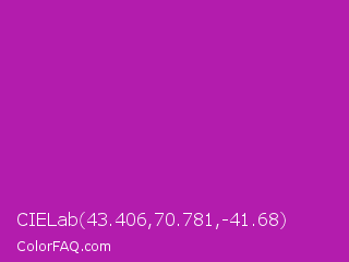CIELab 43.406,70.781,-41.68 Color is a normal magenta color and the nearest color is Byzantine #bd33a4. Hex code #b31cad and RGB value is rgb(179,28,173). In RGB color space, this color is composed of 70% red, 11% green, 68% blue, In CMYK color space, this color is composed of 0% cyan, 84% magenta, 3% yellow , 30% black , In HSL color space, this color has a hue angle of 302° , 73% saturation and 41% lightness.