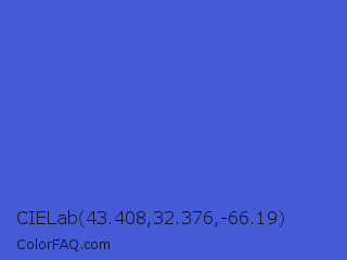 CIELab 43.408,32.376,-66.19 Color is a normal blue color and the nearest color is Royal Blue #4169e1. Hex code #455ad6 and RGB value is rgb(69,90,214). In RGB color space, this color is composed of 27% red, 35% green, 84% blue, In CMYK color space, this color is composed of 68% cyan, 58% magenta, 0% yellow , 16% black , In HSL color space, this color has a hue angle of 231° , 64% saturation and 55% lightness.