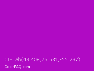 CIELab 43.408,76.531,-55.237 Color is a normal magenta color and the nearest color is Heliotrope Magenta #aa00bb. Hex code #b00ac4 and RGB value is rgb(176,10,196). In RGB color space, this color is composed of 69% red, 4% green, 77% blue, In CMYK color space, this color is composed of 10% cyan, 95% magenta, 0% yellow , 23% black , In HSL color space, this color has a hue angle of 294° , 90% saturation and 40% lightness.