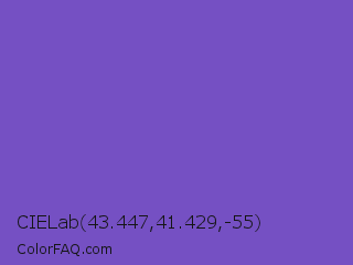 CIELab 43.447,41.429,-55 Color is a normal indigo color and the nearest color is Fuchsia Blue #7a58c1. Hex code #7550c3 and RGB value is rgb(117,80,195). In RGB color space, this color is composed of 46% red, 31% green, 76% blue, In CMYK color space, this color is composed of 40% cyan, 59% magenta, 0% yellow , 24% black , In HSL color space, this color has a hue angle of 259° , 49% saturation and 54% lightness.