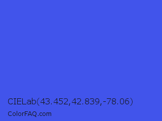CIELab 43.452,42.839,-78.06 Color is a normal blue color and the nearest color is Ultramarine Blue #4166f5. Hex code #4154eb and RGB value is rgb(65,84,235). In RGB color space, this color is composed of 25% red, 33% green, 92% blue, In CMYK color space, this color is composed of 72% cyan, 64% magenta, 0% yellow , 8% black , In HSL color space, this color has a hue angle of 233° , 81% saturation and 59% lightness.