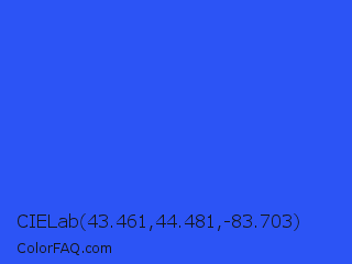 CIELab 43.461,44.481,-83.703 Color is a normal blue color and the nearest color is Ultramarine Blue #4166f5. Hex code #2c54f5 and RGB value is rgb(44,84,245). In RGB color space, this color is composed of 17% red, 33% green, 96% blue, In CMYK color space, this color is composed of 82% cyan, 66% magenta, 0% yellow , 4% black , In HSL color space, this color has a hue angle of 228° , 91% saturation and 57% lightness.