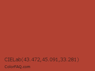 CIELab 43.472,45.091,33.281 Color is a normal red color and the nearest color is Medium Carmine #af4035. Hex code #b24132 and RGB value is rgb(178,65,50). In RGB color space, this color is composed of 70% red, 25% green, 20% blue, In CMYK color space, this color is composed of 0% cyan, 63% magenta, 72% yellow , 30% black , In HSL color space, this color has a hue angle of 7° , 56% saturation and 45% lightness.