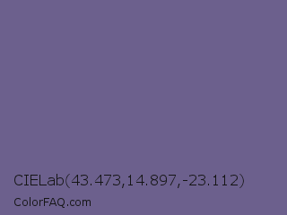 CIELab 43.473,14.897,-23.112 Color is a normal indigo color and the nearest color is Dark Blue Gray #666699. Hex code #6c608d and RGB value is rgb(108,96,141). In RGB color space, this color is composed of 42% red, 38% green, 55% blue, In CMYK color space, this color is composed of 23% cyan, 32% magenta, 0% yellow , 45% black , In HSL color space, this color has a hue angle of 256° , 19% saturation and 46% lightness.