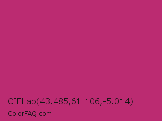 CIELab 43.485,61.106,-5.014 Color is a normal rose color and the nearest color is Hibiscus #b6316c. Hex code #bb2b71 and RGB value is rgb(187,43,113). In RGB color space, this color is composed of 73% red, 17% green, 44% blue, In CMYK color space, this color is composed of 0% cyan, 77% magenta, 40% yellow , 27% black , In HSL color space, this color has a hue angle of 331° , 63% saturation and 45% lightness.
