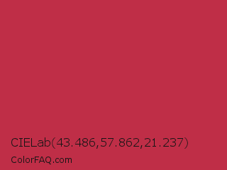 CIELab 43.486,57.862,21.237 Color is a normal red color and the nearest color is French Raspberry #c72c48. Hex code #bf2e47 and RGB value is rgb(191,46,71). In RGB color space, this color is composed of 75% red, 18% green, 28% blue, In CMYK color space, this color is composed of 0% cyan, 76% magenta, 63% yellow , 25% black , In HSL color space, this color has a hue angle of 350° , 61% saturation and 46% lightness.
