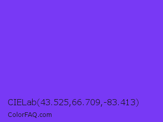 CIELab 43.525,66.709,-83.413 Color is a normal indigo color and the nearest color is Blue Violet #8a2be2. Hex code #7839f5 and RGB value is rgb(120,57,245). In RGB color space, this color is composed of 47% red, 22% green, 96% blue, In CMYK color space, this color is composed of 51% cyan, 77% magenta, 0% yellow , 4% black , In HSL color space, this color has a hue angle of 260° , 90% saturation and 59% lightness.