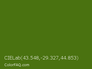 CIELab 43.548,-29.327,44.853 Color is a dark green color and the nearest color is Green Leaf #436a0d. Hex code #4a7210 and RGB value is rgb(74,114,16). In RGB color space, this color is composed of 29% red, 45% green, 6% blue, In CMYK color space, this color is composed of 35% cyan, 0% magenta, 86% yellow , 55% black , In HSL color space, this color has a hue angle of 84° , 75% saturation and 25% lightness.