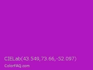 CIELab 43.549,73.66,-52.097 Color is a normal magenta color and the nearest color is Heliotrope Magenta #aa00bb. Hex code #af18bf and RGB value is rgb(175,24,191). In RGB color space, this color is composed of 69% red, 9% green, 75% blue, In CMYK color space, this color is composed of 8% cyan, 87% magenta, 0% yellow , 25% black , In HSL color space, this color has a hue angle of 294° , 78% saturation and 42% lightness.