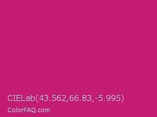CIELab 43.562,66.83,-5.995 Color is a normal rose color and the nearest color is Magenta Dye #ca1f7b. Hex code #c21c73 and RGB value is rgb(194,28,115). In RGB color space, this color is composed of 76% red, 11% green, 45% blue, In CMYK color space, this color is composed of 0% cyan, 86% magenta, 41% yellow , 24% black , In HSL color space, this color has a hue angle of 329° , 75% saturation and 44% lightness.