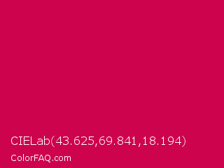 CIELab 43.625,69.841,18.194 Color is a normal rose color and the nearest color is Spanish Carmine #d10047. Hex code #cd034d and RGB value is rgb(205,3,77). In RGB color space, this color is composed of 80% red, 1% green, 30% blue, In CMYK color space, this color is composed of 0% cyan, 99% magenta, 62% yellow , 20% black , In HSL color space, this color has a hue angle of 338° , 97% saturation and 41% lightness.