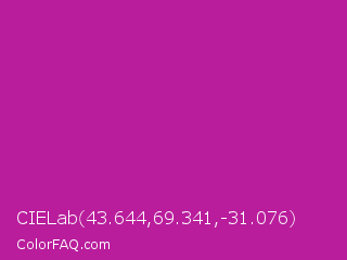 CIELab 43.644,69.341,-31.076 Color is a normal magenta color and the nearest color is Byzantine #bd33a4. Hex code #b91d9c and RGB value is rgb(185,29,156). In RGB color space, this color is composed of 73% red, 11% green, 61% blue, In CMYK color space, this color is composed of 0% cyan, 84% magenta, 16% yellow , 27% black , In HSL color space, this color has a hue angle of 311° , 73% saturation and 42% lightness.