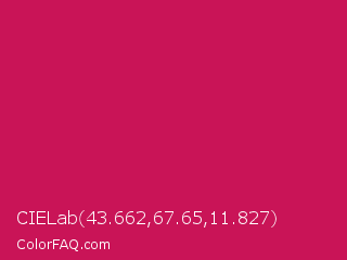 CIELab 43.662,67.65,11.827 Color is a normal rose color and the nearest color is Rose Red #c21e56. Hex code #c91457 and RGB value is rgb(201,20,87). In RGB color space, this color is composed of 79% red, 8% green, 34% blue, In CMYK color space, this color is composed of 0% cyan, 90% magenta, 57% yellow , 21% black , In HSL color space, this color has a hue angle of 338° , 82% saturation and 43% lightness.