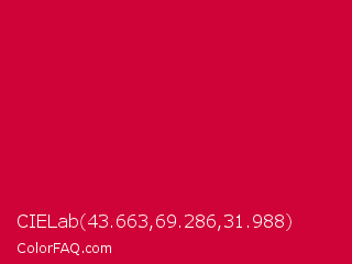 CIELab 43.663,69.286,31.988 Color is a normal red color and the nearest color is Vivid Crimson #cc0033. Hex code #cf0337 and RGB value is rgb(207,3,55). In RGB color space, this color is composed of 81% red, 1% green, 22% blue, In CMYK color space, this color is composed of 0% cyan, 99% magenta, 73% yellow , 19% black , In HSL color space, this color has a hue angle of 345° , 97% saturation and 41% lightness.