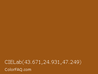 CIELab 43.671,24.931,47.249 Color is a normal orange color and the nearest color is Hawaiian Tan #9d5616. Hex code #9c5513 and RGB value is rgb(156,85,19). In RGB color space, this color is composed of 61% red, 33% green, 7% blue, In CMYK color space, this color is composed of 0% cyan, 46% magenta, 88% yellow , 39% black , In HSL color space, this color has a hue angle of 29° , 78% saturation and 34% lightness.