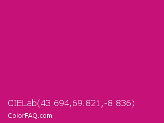 CIELab 43.694,69.821,-8.836 Color is a normal magenta color and the nearest color is Red Violet #c71585. Hex code #c51178 and RGB value is rgb(197,17,120). In RGB color space, this color is composed of 77% red, 7% green, 47% blue, In CMYK color space, this color is composed of 0% cyan, 91% magenta, 39% yellow , 23% black , In HSL color space, this color has a hue angle of 326° , 84% saturation and 42% lightness.