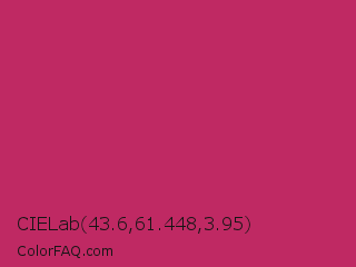 CIELab 43.6,61.448,3.95 Color is a normal rose color and the nearest color is Hibiscus #b6316c. Hex code #bf2963 and RGB value is rgb(191,41,99). In RGB color space, this color is composed of 75% red, 16% green, 39% blue, In CMYK color space, this color is composed of 0% cyan, 79% magenta, 48% yellow , 25% black , In HSL color space, this color has a hue angle of 337° , 65% saturation and 45% lightness.