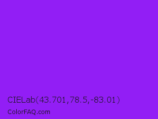 CIELab 43.701,78.5,-83.01 Color is a normal purple color and the nearest color is Veronica #a020f0. Hex code #921ef5 and RGB value is rgb(146,30,245). In RGB color space, this color is composed of 57% red, 12% green, 96% blue, In CMYK color space, this color is composed of 40% cyan, 88% magenta, 0% yellow , 4% black , In HSL color space, this color has a hue angle of 272° , 91% saturation and 54% lightness.