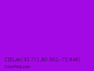 CIELab 43.711,80.562,-73.848 Color is a normal purple color and the nearest color is Vivid Mulberry #b80ce3. Hex code #a309e5 and RGB value is rgb(163,9,229). In RGB color space, this color is composed of 64% red, 4% green, 90% blue, In CMYK color space, this color is composed of 29% cyan, 96% magenta, 0% yellow , 10% black , In HSL color space, this color has a hue angle of 282° , 92% saturation and 47% lightness.