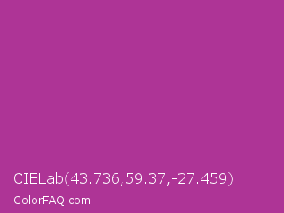 CIELab 43.736,59.37,-27.459 Color is a normal magenta color and the nearest color is Fandango #b53389. Hex code #ae3496 and RGB value is rgb(174,52,150). In RGB color space, this color is composed of 68% red, 20% green, 59% blue, In CMYK color space, this color is composed of 0% cyan, 70% magenta, 14% yellow , 32% black , In HSL color space, this color has a hue angle of 312° , 54% saturation and 44% lightness.