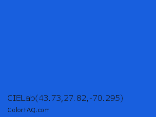 CIELab 43.73,27.82,-70.295 Color is a normal blue color and the nearest color is Bright Navy Blue #1974d2. Hex code #185fde and RGB value is rgb(24,95,222). In RGB color space, this color is composed of 9% red, 37% green, 87% blue, In CMYK color space, this color is composed of 89% cyan, 57% magenta, 0% yellow , 13% black , In HSL color space, this color has a hue angle of 218° , 80% saturation and 48% lightness.