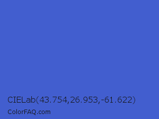 CIELab 43.754,26.953,-61.622 Color is a normal blue color and the nearest color is Han Blue #446ccf. Hex code #425ecf and RGB value is rgb(66,94,207). In RGB color space, this color is composed of 26% red, 37% green, 81% blue, In CMYK color space, this color is composed of 68% cyan, 55% magenta, 0% yellow , 19% black , In HSL color space, this color has a hue angle of 228° , 59% saturation and 54% lightness.