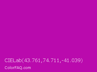 CIELab 43.761,74.711,-41.039 Color is a normal magenta color and the nearest color is Heliotrope Magenta #aa00bb. Hex code #ba0aad and RGB value is rgb(186,10,173). In RGB color space, this color is composed of 73% red, 4% green, 68% blue, In CMYK color space, this color is composed of 0% cyan, 95% magenta, 7% yellow , 27% black , In HSL color space, this color has a hue angle of 304° , 90% saturation and 38% lightness.
