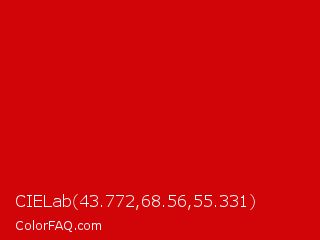CIELab 43.772,68.56,55.331 Color is a normal red color and the nearest color is Rosso Corsa #d40000. Hex code #d10508 and RGB value is rgb(209,5,8). In RGB color space, this color is composed of 82% red, 2% green, 3% blue, In CMYK color space, this color is composed of 0% cyan, 98% magenta, 96% yellow , 18% black , In HSL color space, this color has a hue angle of 359° , 95% saturation and 42% lightness.
