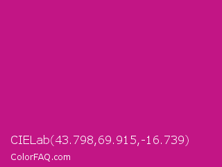 CIELab 43.798,69.915,-16.739 Color is a normal magenta color and the nearest color is Red Violet #c71585. Hex code #c21585 and RGB value is rgb(194,21,133). In RGB color space, this color is composed of 76% red, 8% green, 52% blue, In CMYK color space, this color is composed of 0% cyan, 89% magenta, 31% yellow , 24% black , In HSL color space, this color has a hue angle of 321° , 80% saturation and 42% lightness.