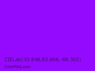 CIELab 43.848,83.868,-88.365 Color is a normal purple color and the nearest color is Electric Violet #8f00ff. Hex code #940aff and RGB value is rgb(148,10,255). In RGB color space, this color is composed of 58% red, 4% green, 100% blue, In CMYK color space, this color is composed of 42% cyan, 96% magenta, 0% yellow , 0% black , In HSL color space, this color has a hue angle of 274° , 100% saturation and 52% lightness.
