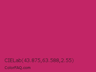 CIELab 43.875,63.588,2.55 Color is a normal rose color and the nearest color is Rose Red #c21e56. Hex code #c22566 and RGB value is rgb(194,37,102). In RGB color space, this color is composed of 76% red, 15% green, 40% blue, In CMYK color space, this color is composed of 0% cyan, 81% magenta, 47% yellow , 24% black , In HSL color space, this color has a hue angle of 335° , 68% saturation and 45% lightness.