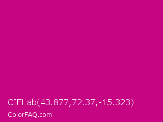 CIELab 43.877,72.37,-15.323 Color is a normal magenta color and the nearest color is Red Violet #c71585. Hex code #c60583 and RGB value is rgb(198,5,131). In RGB color space, this color is composed of 78% red, 2% green, 51% blue, In CMYK color space, this color is composed of 0% cyan, 97% magenta, 34% yellow , 22% black , In HSL color space, this color has a hue angle of 321° , 95% saturation and 40% lightness.