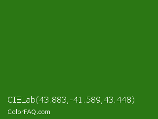 CIELab 43.883,-41.589,43.448 Color is a dark green color and the nearest color is Bilbao #327c14. Hex code #2b7714 and RGB value is rgb(43,119,20). In RGB color space, this color is composed of 17% red, 47% green, 8% blue, In CMYK color space, this color is composed of 64% cyan, 0% magenta, 83% yellow , 53% black , In HSL color space, this color has a hue angle of 106° , 71% saturation and 27% lightness.