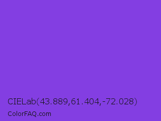 CIELab 43.889,61.404,-72.028 Color is a normal violet color and the nearest color is Blue Violet #8a2be2. Hex code #833ee2 and RGB value is rgb(131,62,226). In RGB color space, this color is composed of 51% red, 24% green, 89% blue, In CMYK color space, this color is composed of 42% cyan, 73% magenta, 0% yellow , 11% black , In HSL color space, this color has a hue angle of 265° , 74% saturation and 56% lightness.