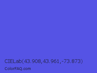 CIELab 43.908,43.961,-73.873 Color is a light indigo color and the nearest color is Majorelle Blue #6050dc. Hex code #5553e5 and RGB value is rgb(85,83,229). In RGB color space, this color is composed of 33% red, 33% green, 90% blue, In CMYK color space, this color is composed of 63% cyan, 64% magenta, 0% yellow , 10% black , In HSL color space, this color has a hue angle of 241° , 74% saturation and 61% lightness.