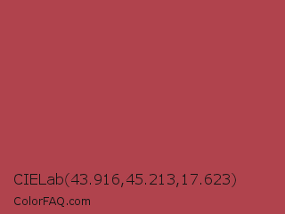 CIELab 43.916,45.213,17.623 Color is a normal red color and the nearest color is English Red #ab4b52. Hex code #b0434d and RGB value is rgb(176,67,77). In RGB color space, this color is composed of 69% red, 26% green, 30% blue, In CMYK color space, this color is composed of 0% cyan, 62% magenta, 56% yellow , 31% black , In HSL color space, this color has a hue angle of 354° , 45% saturation and 48% lightness.