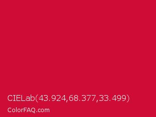 CIELab 43.924,68.377,33.499 Color is a normal red color and the nearest color is Vivid Crimson #cc0033. Hex code #cf0c35 and RGB value is rgb(207,12,53). In RGB color space, this color is composed of 81% red, 5% green, 21% blue, In CMYK color space, this color is composed of 0% cyan, 94% magenta, 74% yellow , 19% black , In HSL color space, this color has a hue angle of 347° , 89% saturation and 43% lightness.