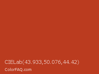 CIELab 43.933,50.076,44.42 Color is a normal red color and the nearest color is Dark Pastel Red #c23b22. Hex code #bb3b1f and RGB value is rgb(187,59,31). In RGB color space, this color is composed of 73% red, 23% green, 12% blue, In CMYK color space, this color is composed of 0% cyan, 68% magenta, 83% yellow , 27% black , In HSL color space, this color has a hue angle of 11° , 72% saturation and 43% lightness.