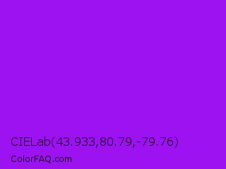 CIELab 43.933,80.79,-79.76 Color is a normal purple color and the nearest color is Veronica #a020f0. Hex code #9c12f0 and RGB value is rgb(156,18,240). In RGB color space, this color is composed of 61% red, 7% green, 94% blue, In CMYK color space, this color is composed of 35% cyan, 93% magenta, 0% yellow , 6% black , In HSL color space, this color has a hue angle of 277° , 88% saturation and 51% lightness.