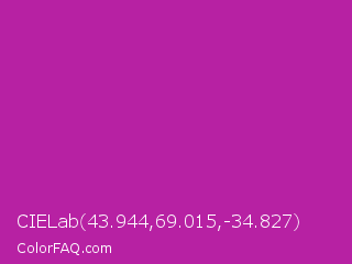 CIELab 43.944,69.015,-34.827 Color is a normal magenta color and the nearest color is Byzantine #bd33a4. Hex code #b721a3 and RGB value is rgb(183,33,163). In RGB color space, this color is composed of 72% red, 13% green, 64% blue, In CMYK color space, this color is composed of 0% cyan, 82% magenta, 11% yellow , 28% black , In HSL color space, this color has a hue angle of 308° , 69% saturation and 42% lightness.