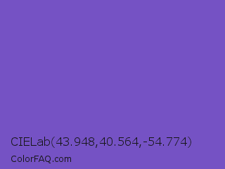 CIELab 43.948,40.564,-54.774 Color is a normal indigo color and the nearest color is Fuchsia Blue #7a58c1. Hex code #7552c4 and RGB value is rgb(117,82,196). In RGB color space, this color is composed of 46% red, 32% green, 77% blue, In CMYK color space, this color is composed of 40% cyan, 58% magenta, 0% yellow , 23% black , In HSL color space, this color has a hue angle of 258° , 49% saturation and 55% lightness.