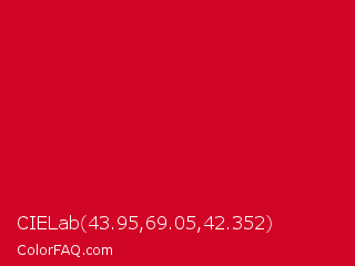 CIELab 43.95,69.05,42.352 Color is a normal red color and the nearest color is Lava #cf1020. Hex code #d10526 and RGB value is rgb(209,5,38). In RGB color space, this color is composed of 82% red, 2% green, 15% blue, In CMYK color space, this color is composed of 0% cyan, 98% magenta, 82% yellow , 18% black , In HSL color space, this color has a hue angle of 350° , 95% saturation and 42% lightness.