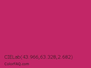 CIELab 43.966,63.328,2.682 Color is a normal rose color and the nearest color is Hibiscus #b6316c. Hex code #c22666 and RGB value is rgb(194,38,102). In RGB color space, this color is composed of 76% red, 15% green, 40% blue, In CMYK color space, this color is composed of 0% cyan, 80% magenta, 47% yellow , 24% black , In HSL color space, this color has a hue angle of 335° , 67% saturation and 45% lightness.